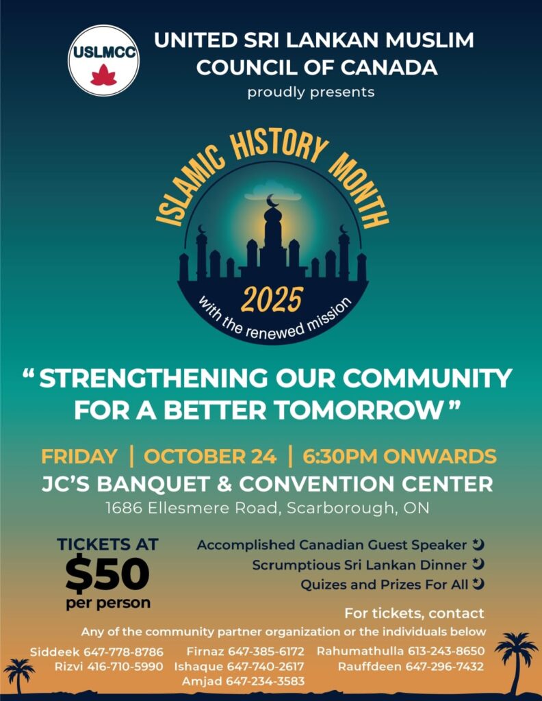 The United Sri Lankan Muslim Council of Canada (USLMCC) is a not for profit organization bringing together Sri Lankan Muslim organizations across Canada on a unified forum as equal partners. We work collaboratively to pragmatically address community challenges, strengthen partnerships, and empower our community members to thrive personally and professionally while contributing positively to the broader Canadian society.